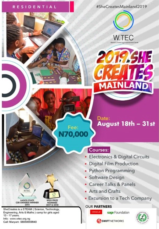 W.TEC is now accepting applications for 2019 She Creates Camp. The camp will hold in Lagos, Kwara and Anambra states from July – September 2019.